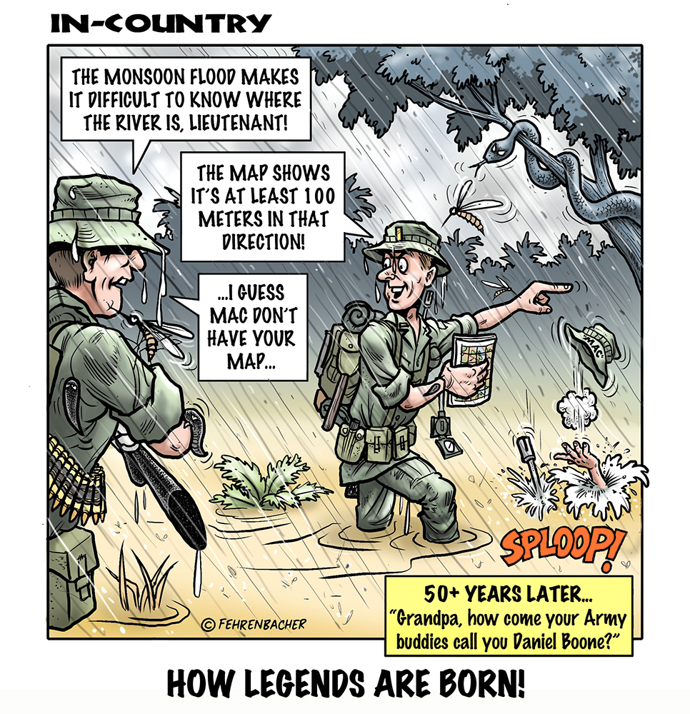 Phil enlisted in the Army in 1965 where he served for years in Vietnam. He became a graphic designer and has worked for the state of Oregon for 26 years. He retired in 2003 and started the Cartoon "In-Country". The cartoons reflect his experiences during his tour of duty in South Vietnam.